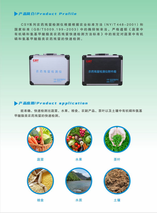 深芬儀器CSY系列農(nóng)藥殘留快速測(cè)定儀可以對(duì)瓜果蔬菜的農(nóng)藥殘留進(jìn)行準(zhǔn)確的檢測(cè)和篩查,杜絕超標(biāo)的農(nóng)產(chǎn)品流入市場(chǎng)。農(nóng)藥殘留快速測(cè)定儀可廣泛應(yīng)用于各級(jí)蔬菜檢測(cè)中心、農(nóng)貿(mào)市場(chǎng)、超市、環(huán)保機(jī)構(gòu)、蔬菜種植基地、飯店、車(chē)載及實(shí)驗(yàn)室等食品安全檢測(cè)與監(jiān)控場(chǎng)所等單位對(duì)果蔬中農(nóng)藥殘留的檢測(cè)。