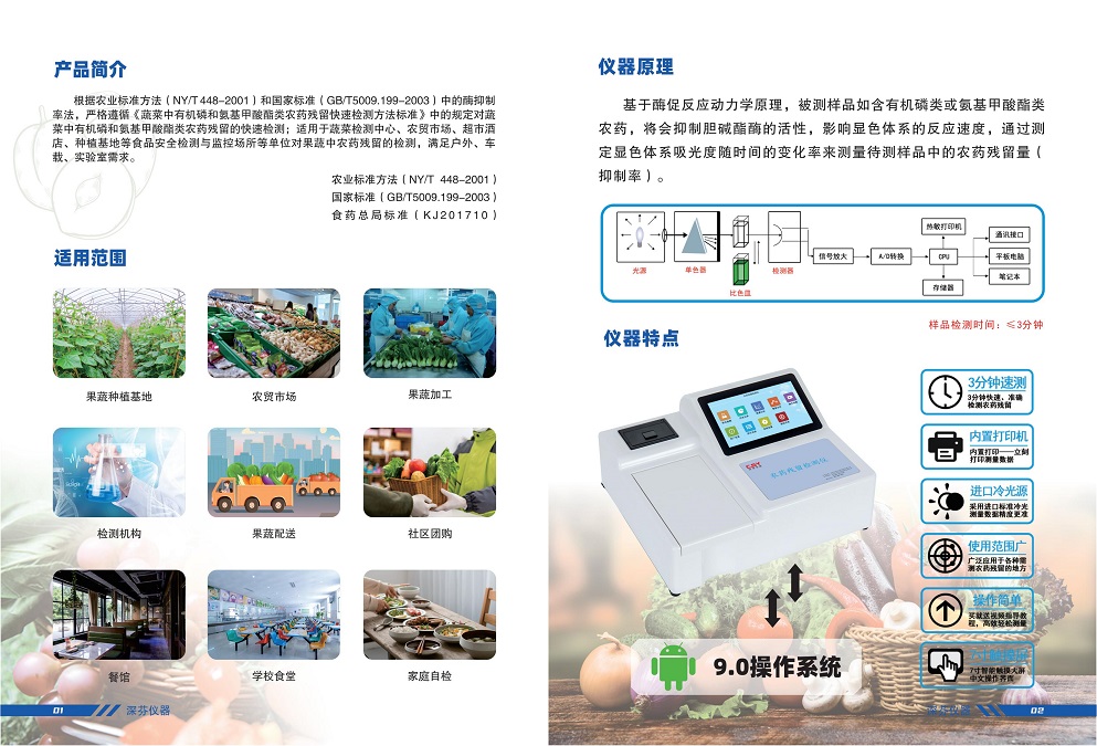 深芬儀器生產(chǎn)的安卓智能型農(nóng)藥殘留測定儀;是根據(jù)農(nóng)業(yè)標(biāo)準(zhǔn)方法(NY/T 448-2001)和國家標(biāo)準(zhǔn)(GB/T5009.199-2003)中的酶抑制率法,嚴格遵循《GB/T5009.199-2003蔬菜中有機磷和氨基甲酸酯類農(nóng)藥殘留快速檢測方法標(biāo)準(zhǔn)》中的規(guī)定對蔬菜中有機磷和氨基甲酸酯類農(nóng)藥殘留的快速檢測??蓮V泛應(yīng)用于各級蔬菜檢測中心、農(nóng)貿(mào)市場、超市、環(huán)保機構(gòu)、蔬菜種植基地、飯店、車載及實驗室等食品安全檢測與監(jiān)控場所等單位對果蔬中農(nóng)藥殘留的檢測。農(nóng)藥殘留測定儀能準(zhǔn)確、快速檢測出蔬菜、水果、糧食、茶葉以及土壤中有機磷和氨基甲酸脂類農(nóng)藥殘留的快速檢測。